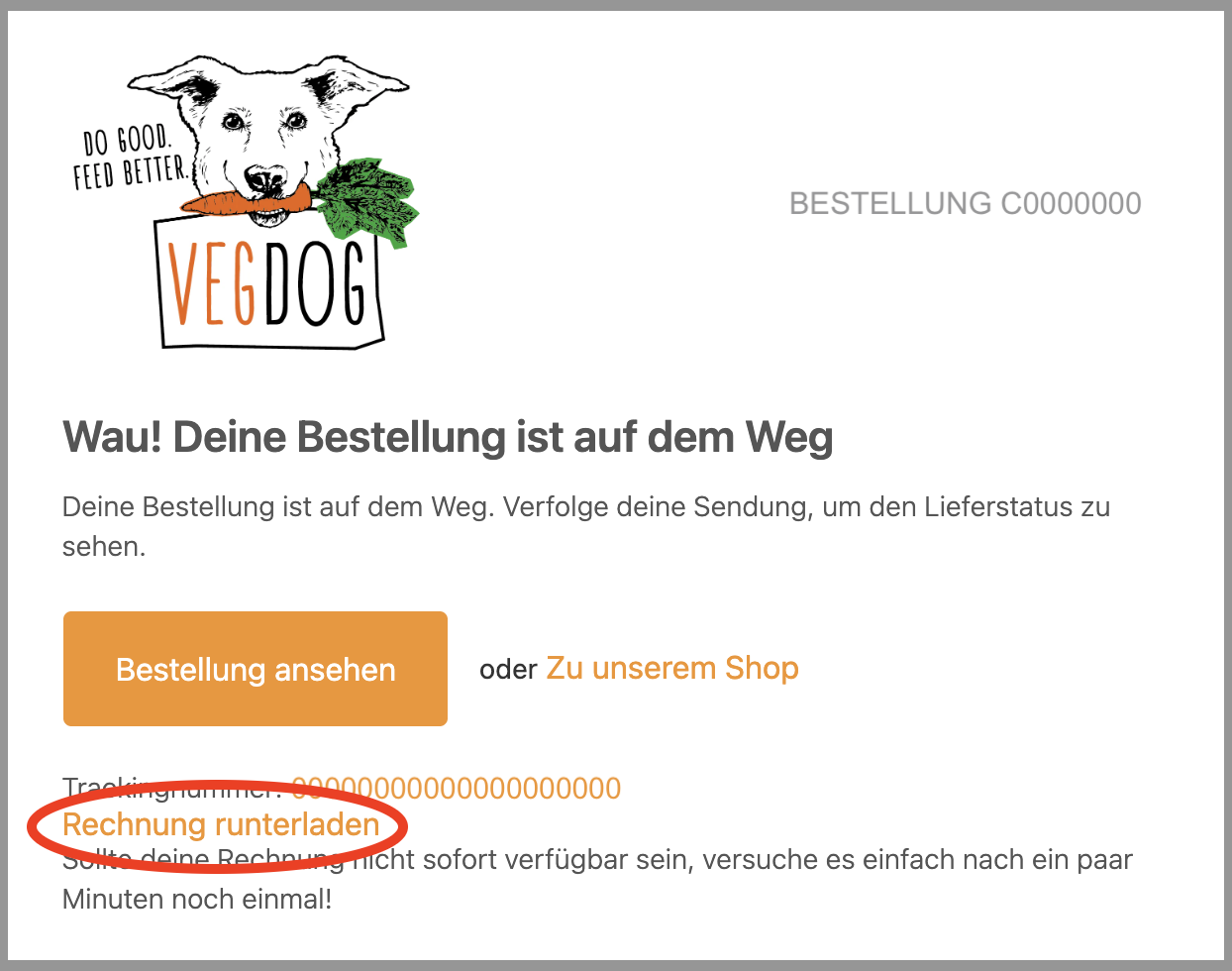 Wenn du eine Rechnung zu deiner Bestellung benötigst, kannst du diese ganz bequem über den entsprechenden Link in der Versandbestätigung deiner Bestellung herunterladen. Den orange eingefärbten Link "Rechnung runterladen" findest du in der E-Mail unterhalb der orangenen Schaltfläche "Bestellung ansehen":